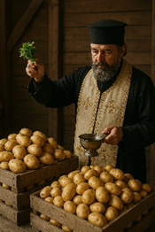 Μπαίνει ο Παπάς, ραντίζοντας αγιασμό.